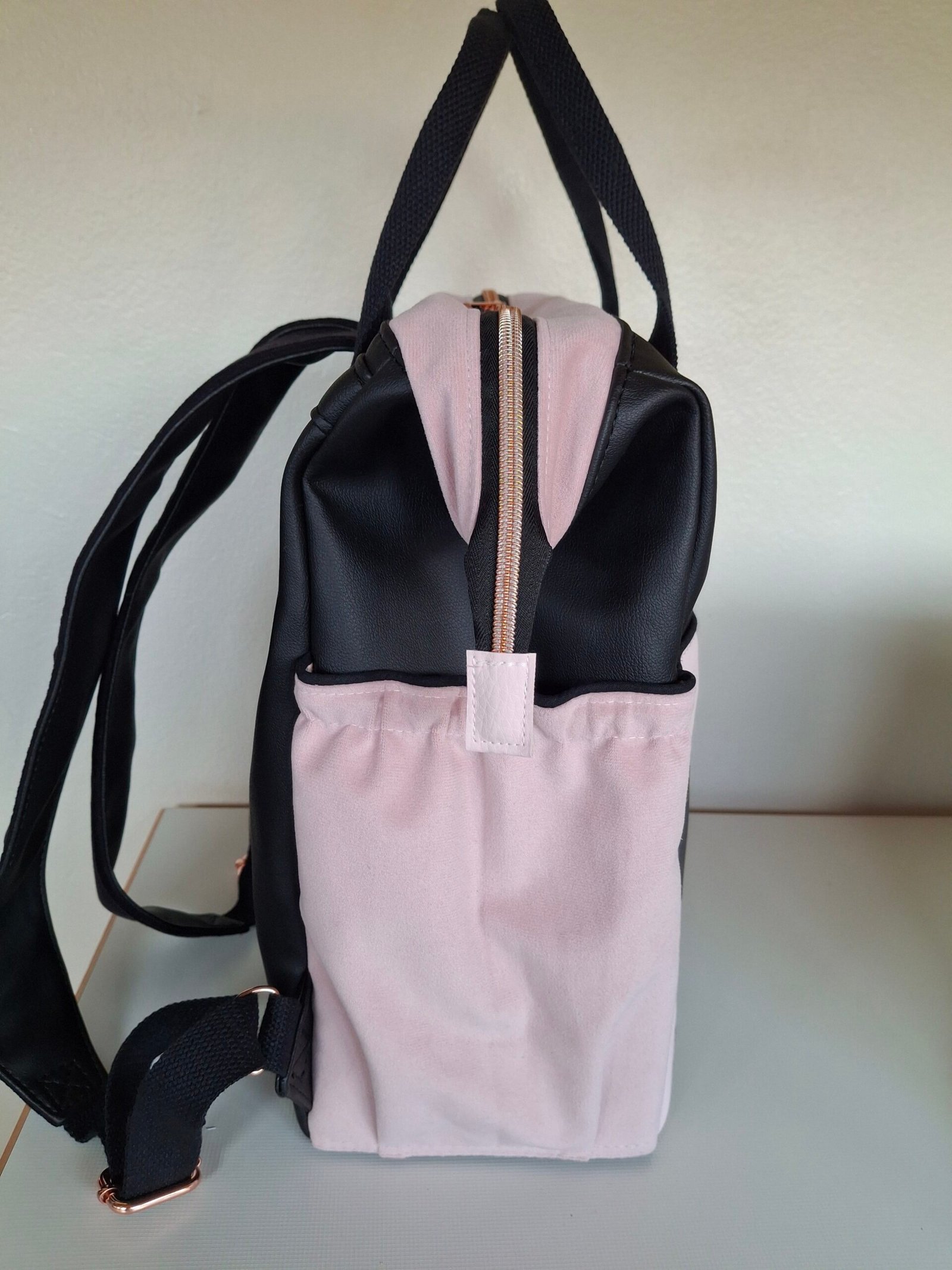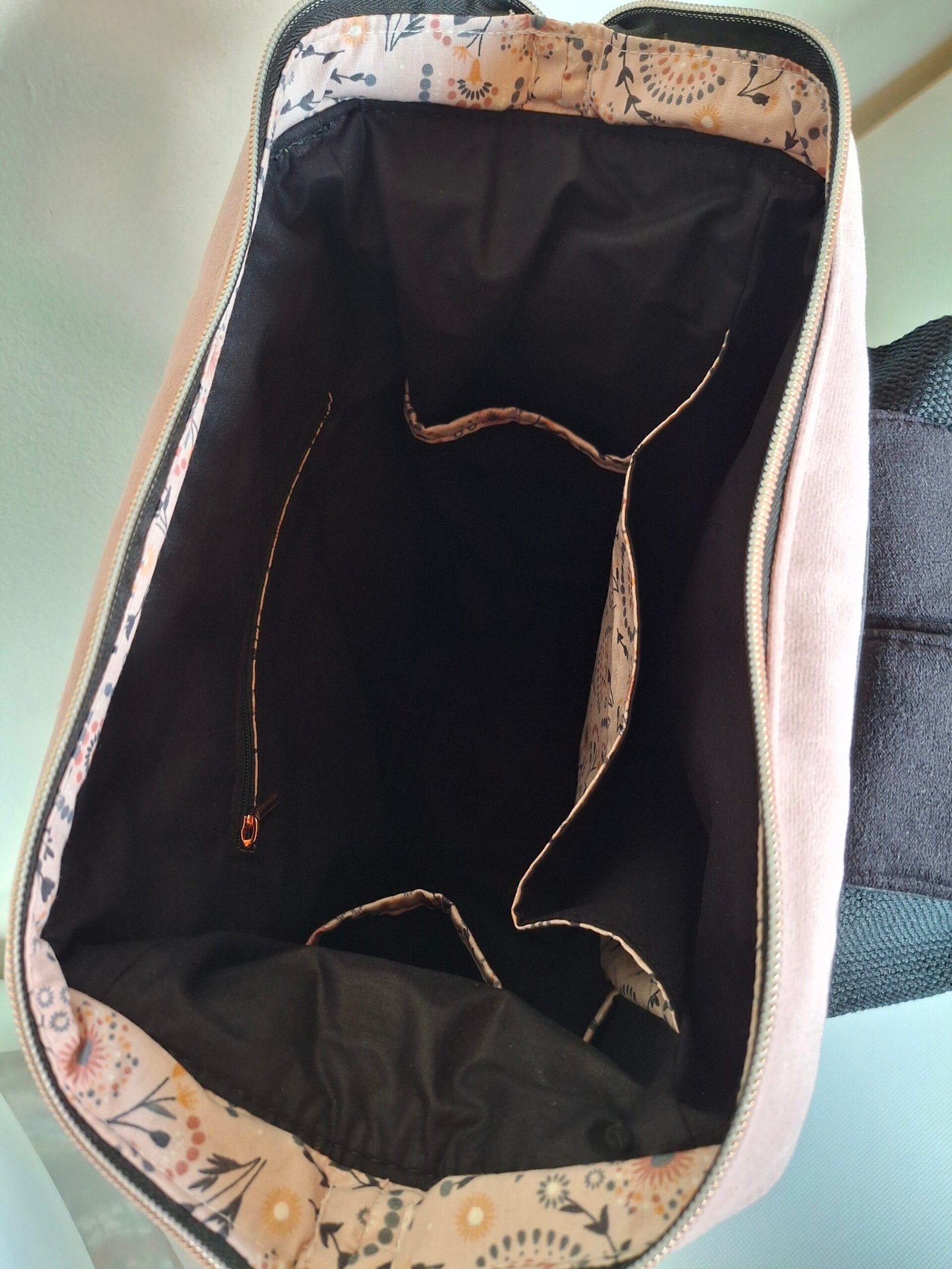 A l’intérieur, une petite poche zippé, une grande poche et deux poches de côté.