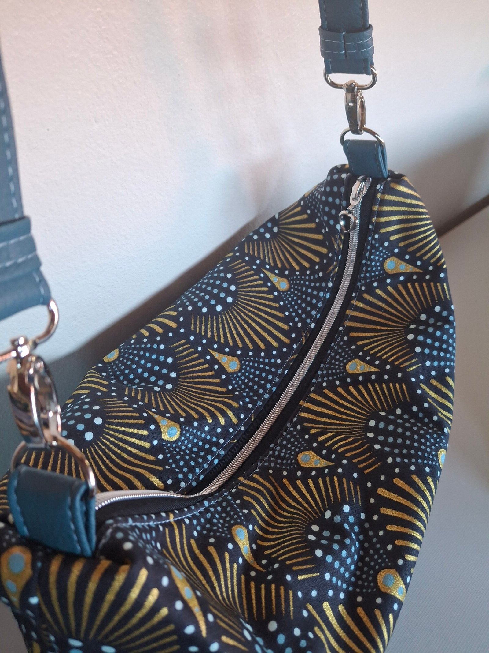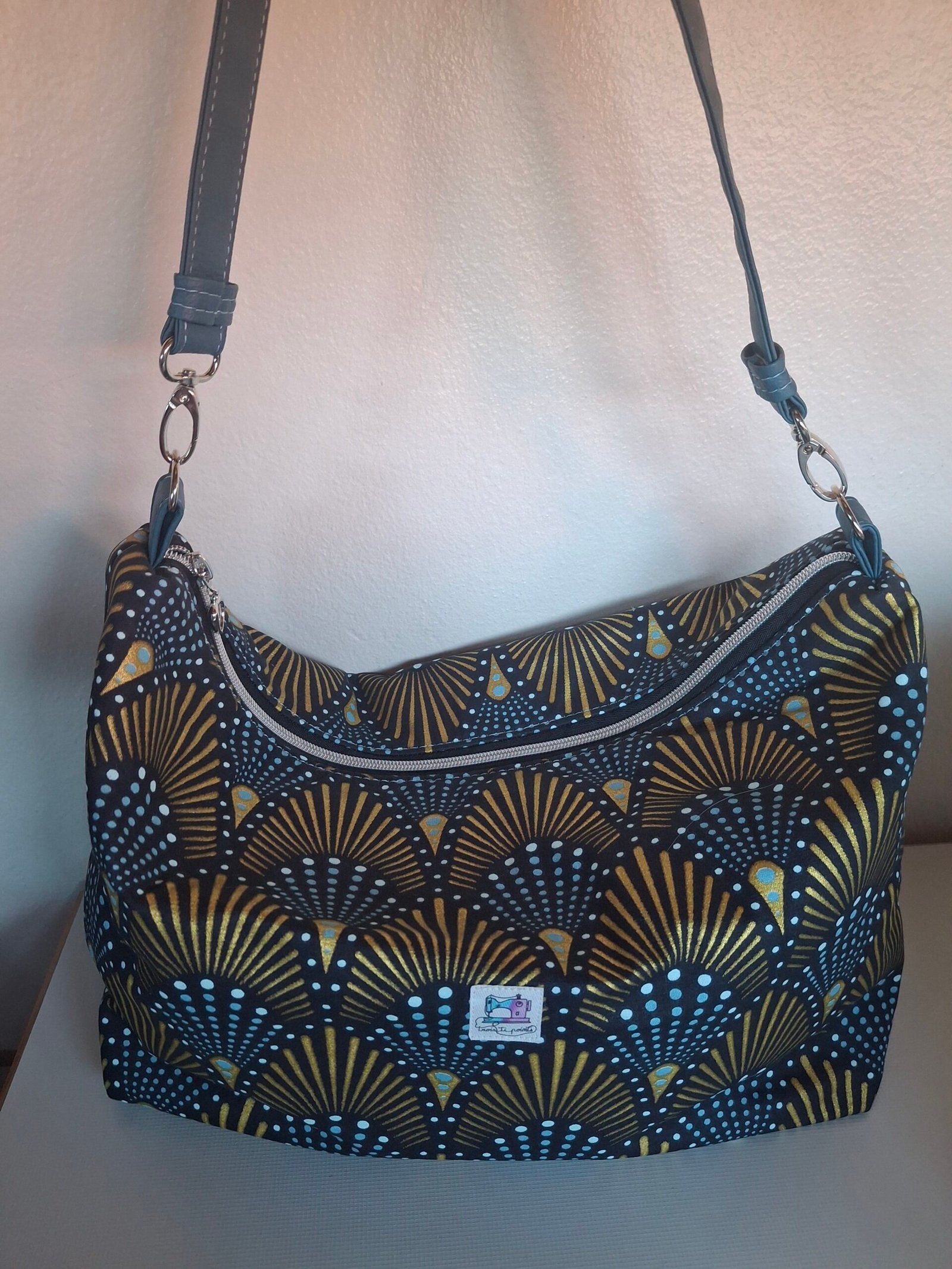 Sac à main en tissu d’ameublement et simili cuir, Sac avec un assez grand volume qui se porte à l’épaule. À l’intérieur une poche zippé et une poche simple. Dimension : longueur 33cm/ hauteur 26cm/largeur 14cm