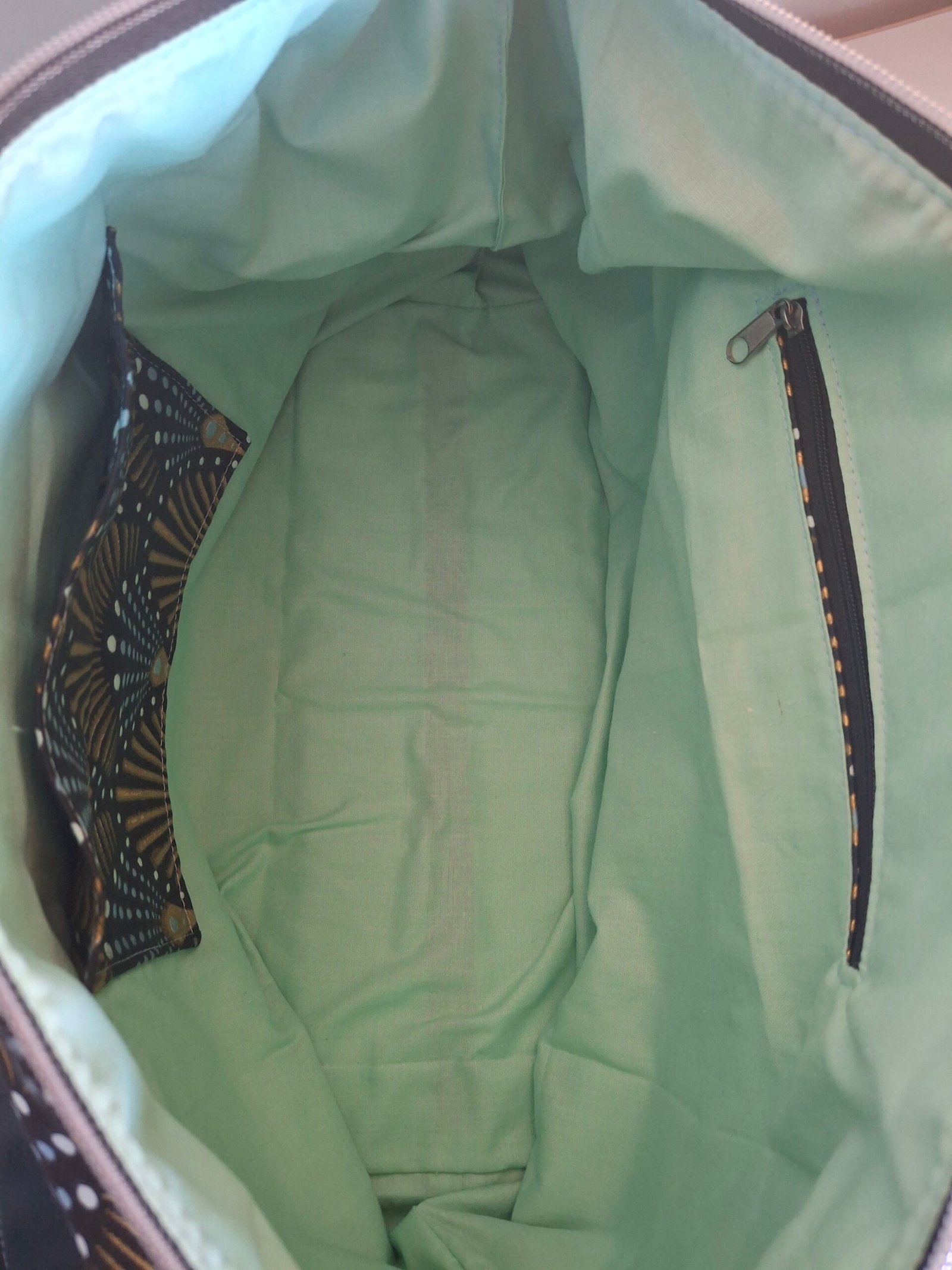 À l’intérieur une poche zippé et une poche simple.