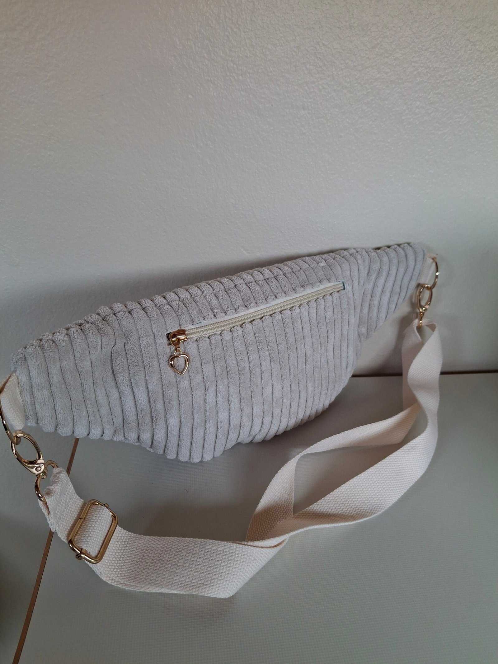 Sac banane en velours côtelé, doublure intérieur coton Se porte en bandoulière ou à la ceinture, grâce à sa sangle reglable. Une poche arrière zippé Une poche intérieur Dimension : longeur 41cm/hauteur 18cm / largeur 9cm